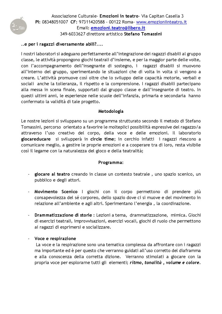 Il teatro è un laboratorio interdisciplinare che valorizza le capacità e le risorse di tutti i bambini: la diversità è un valore inestimabile per costruire nel gruppo la capacità di rispettarsi, riconoscersi, aiutarsi. In un percorso educativo, il teatro porta alla consapevolezza che si sta costruendo qualcosa in cui l’apporto di ognuno è fondamentale.
