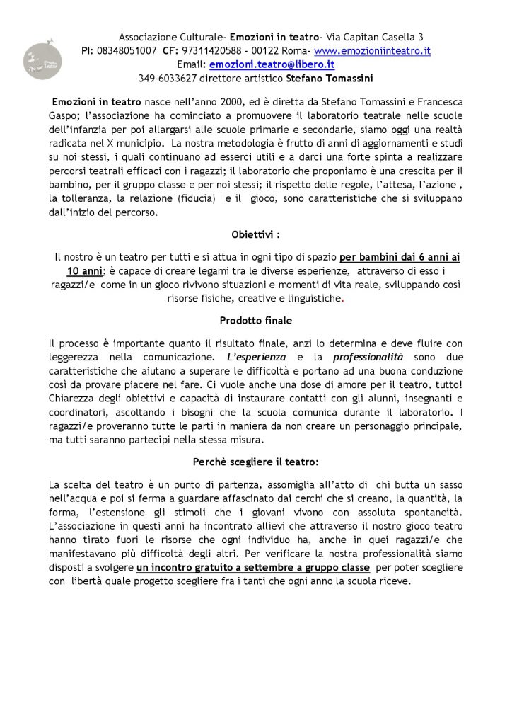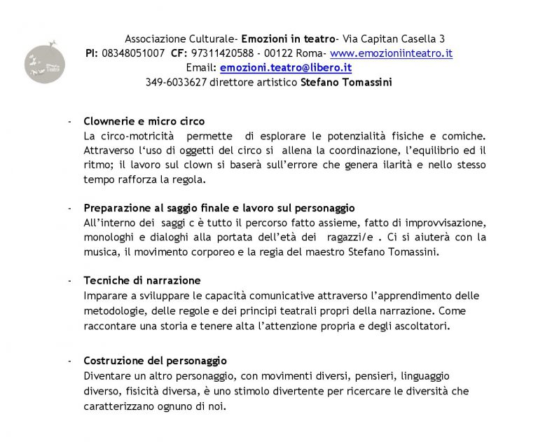 Con l’esperienza del teatro il bambino inizierà a percepire le proprie capacità creative: a comunicare attraverso nuove forme di linguaggio che spaziano dal corpo, alla voce; a prevedere i tempi di osservazione e di ascolto; a trovare una dimensione ed un ruolo nuovi attraverso un percorso formativo in un gruppo consolidato, come quello della classe. Il laboratorio si svolgerà in orario scolastico, da ottobre a maggio, con incontri di un’ora a settimana. Al termine dell’attività di laboratorio, i familiari potranno condividere alcuni momenti espressivi e creativi dei bambini, partecipando alle rappresentazioni teatrali che si svolgeranno nel mese di maggio